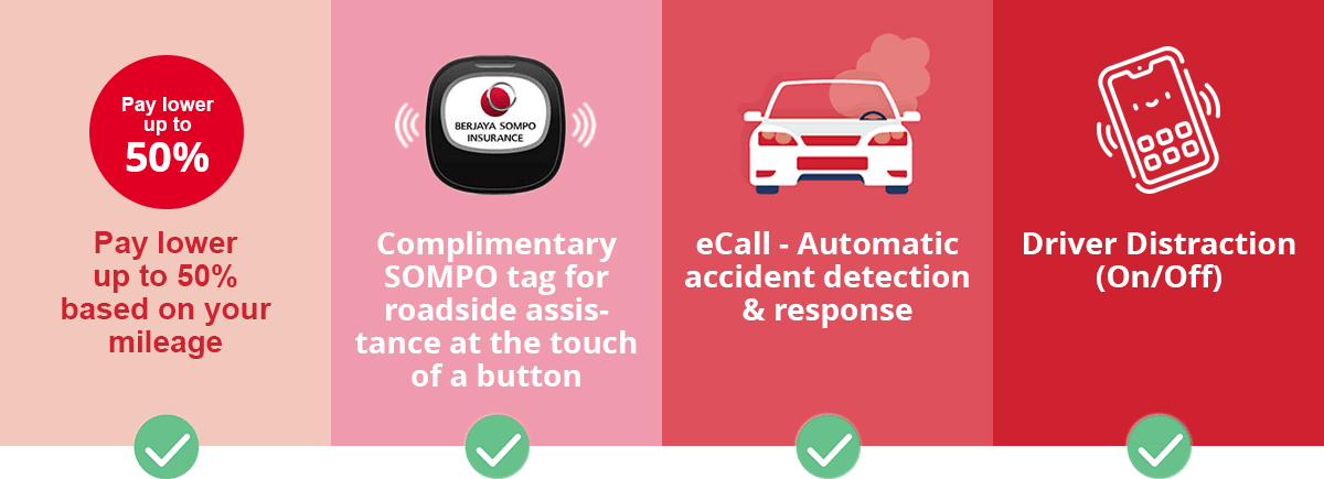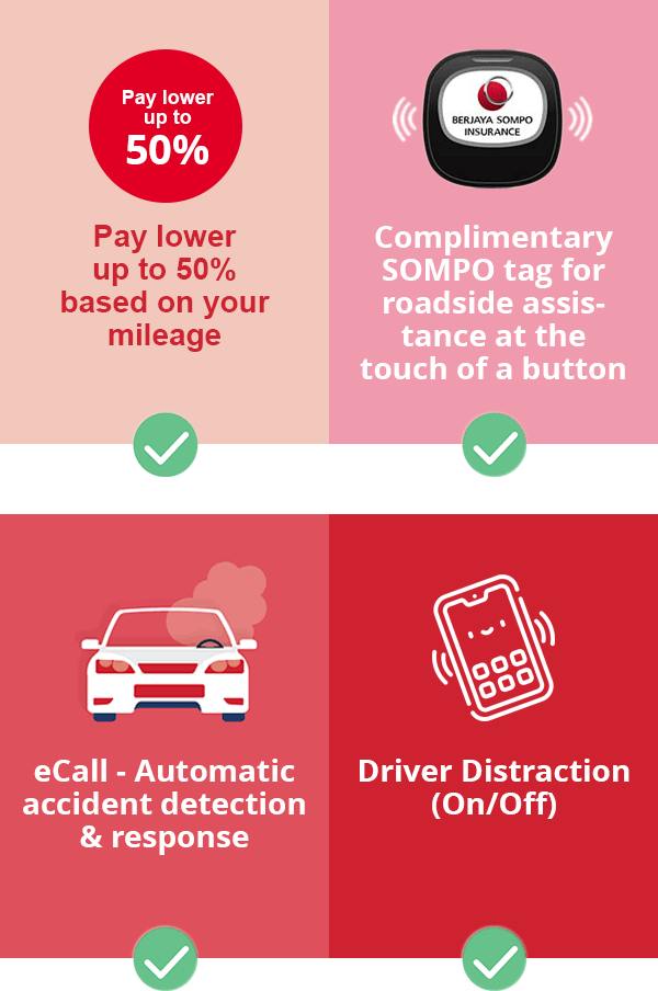 SOMPO MotorSafe is a revolutionary motor insurance plan underwritten by Berjaya Sompo Insurance that lets you choose a mileage plan based on how far you drive in a year, allowing you to pay a lower premium when you drive less, while still providing comprehensive coverage.